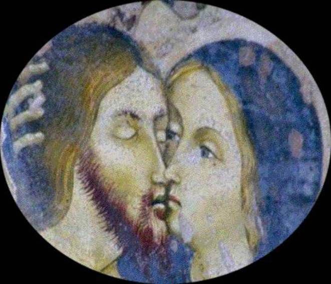 2) De plus, il est clair ici que c’est le personnage féminin qui embrasse Jésus, non l’inverse. Or, dans certains écrits anciens qualifiés de “gnostiques”, c’est toujours Jésus qui prodigue des baisers à “Marie”, non l’inverse. Jésus est toujours actif : il donne. Sur le médaillon, il est passif : il reçoit.
