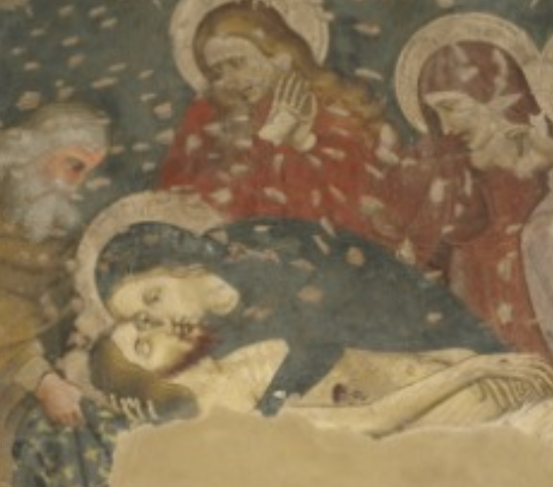 L’image n’est, en réalité, qu’une petite partie d’une fresque mise au jour lors de la restauration de la chapelle Sant’Andrea di Montiglio Monferrato (Italie). Elle nous montre la mise au tombeau (en l’occurrence : un sarcophage) de Jésus après la descente de Croix. C’est Marie, sa mère, qui, penchée en avant, embrasse son fils défunt.