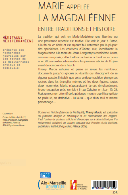Cet opuscule reprend l’essentiel des informations et des découvertes récemment publiées dans : Marie appelée la Magdaléenne – ier - viiie siècle – Entre Traditions et Histoire (Presses Universitaires de Provence, 2017). Il a été réalisé afin de permettre au public le plus large possible d’avoir facilement accès au résultat de ces investigations.