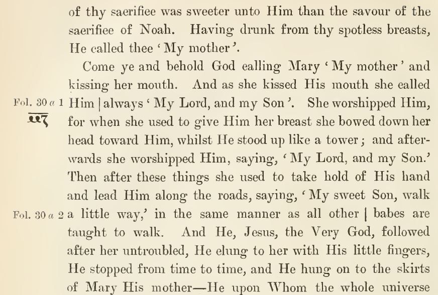 “O mon bien-aimé, peuple épris de Dieu, ouvrez les oreilles de votre cœur et écoutez l’histoire de l’honneur de la Mère de Dieu, reine de toutes les femmes, la véritable épouse, que le Fils de Dieu portait en haute estime. Il est venu et a habité dans son ventre pendant neuf mois et elle l’a porté pour nous à Bethléem. Elle l’enveloppa dans des lambeaux d’étoffes, elle le coucha dans une mangeoire à bétail ; et les bêtes l’ont regardé et l’ont reconnu, et elles l’ont protégé. Tu as tendu ton bras droit, tu l’as pris et tu l’as fait coucher sur ton bras gauche. Tu as plié ton cou et laissé tes cheveux tomber sur lui. Tu as embrassé sa bouche de la même manière que le Père a embrassé sa bouche au Ciel et tu l’as assis sur tes genoux. Il leva les yeux vers ton visage. Il a étendu sa main, il a pris ta poitrine et a attiré dans sa bouche le lait plus sucré que la manne. La saveur de ton sacrifice lui était plus douce que la saveur du sacrifice de Noé. Ayant bu à tes seins immaculés, il t’appela “ma Mère”. Venez et voyez Dieu appelant Marie “ma Mère” et embrasser sa bouche. Et comme elle embrassait sa bouche, elle l’appelait toujours “Mon Seigneur et mon Fils”. Elle l’adorait, car quand elle lui donnait sa poitrine, elle s’inclinait devant lui, tandis qu’il se dressait comme une tour ; et ensuite elle l’adorait en disant : “Mon Seigneur et mon Fils”. Puis, après ces choses, elle avait l’habitude de lui prendre la main et de le conduire le long des routes en disant : “Mon doux Fils, marche un peu, de la même manière que tous les autres bébés doivent marcher.” Et Lui, Jésus, le Dieu même, la suivait sans trouble. Il s’accrochait à elle avec ses petits doigts, il s’arrêtait de temps en temps, et il s’accrochait à la robe de Marie, sa Mère – Celui à qui tout l’univers est suspendu ! Il levait les yeux vers son visage – Celui sur qui tout l’univers est suspendu et par qui il est maintenu en ordre – et elle, elle l’aurait rattrapé par elle-même, l’aurait hissé dans ses bras et aurait marché avec lui.