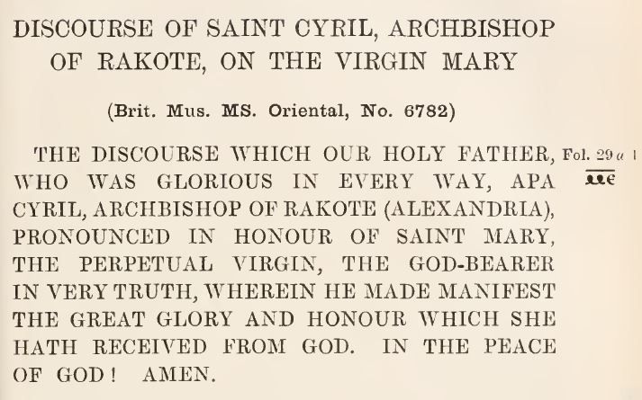 Ce texte du Pseudo-Cyrille (Discours sur la Vierge Marie), rédigé en copte, a été publié par E. A. W. Budge, dans Miscellaneous Coptic Texts in the Dialect of Upper Egypt, Londres, 1915, p. 717-718. Encore une fois, la Vierge Marie est appelée l’“épouse” de Jésus (nous nous situons ici à un niveau spirituel, non charnel) et tous deux s’embrassent sur la bouche.